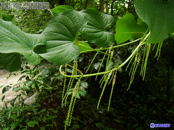 多年生缠绕草本。根状茎短,根直生,肉质肥厚,呈圆柱状棍棒形,长可达1米,直径2~7厘米,外皮灰褐色,生多数须根,质脆,断面白色带粘性。茎细长,通常带紫色,有棱线,光滑无毛。叶对生或3片轮生,叶腋常生珠芽名“零余子”,俗称“山药豆”。叶片形状多变化,三角状卵形至三角状宽卵形,长3.5~7厘米,通常三裂,侧裂片圆耳状,中裂片先端渐尖;叶脉7~9条自叶基发出。6~8月开花,花雌雄异株,极小,黄绿色,均成穗状花序,雄花序直立,雌花序下垂。花乳白色,花被6片;雄花有6个雄蕊;雌花花柱3,柱头2岐。蒴果有3棱,呈翅状;种子扁圆形;有宽翅。 |