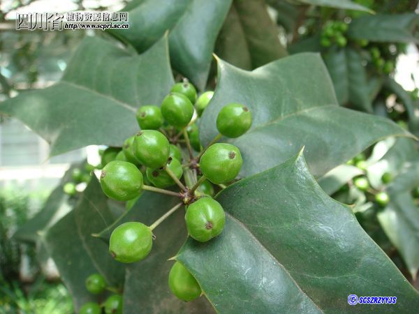 常绿灌木或小乔木,高3-4米。叶硬革质,矩圆状四方形,长4-8厘米,宽2-4厘米,有硬而尖的刺齿3,基部平截,两侧各有尖硬刺齿1-2。花黄绿色,4数,雌雄异株,簇生二年生的枝上。果球形,鲜红色,直径8-10毫米,分核4颗。花期4—5月,果期10—12月。 |