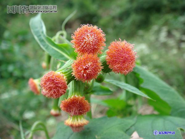 直立草本,高20-120厘米,茎有纵条棱,光滑无毛。叶互生,膜质,椭圆形或长圆状椭圆形,长7-12厘米,宽4-5厘米,顶端渐尖,基部楔形,边缘有不规则锯齿或有时基部羽状分裂,两面近无毛;叶柄长2-2.5厘米。头状花序在茎顶排列成伞房状;总苞钟状,有数枚不 等长的线形小苞片;总苞片1层,线状披针形,等长,顶端有簇状毛,小花全部管状,两性,花冠红褐色或橙红色,檐部5齿裂,花柱基部呈小球状,顶端尖,被乳头状毛。瘦果狭圆柱形,赤红色,有肋,被毛;冠毛极多数,白色,绢毛状,易脱落。花期7-12月。 |